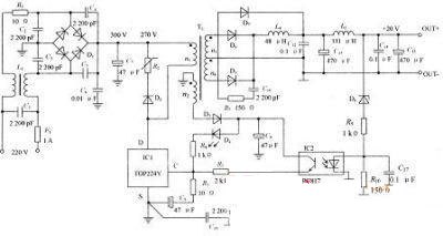 關于中間部分電路而言,TOP224Y作為PWM操控、鼓勵,都是慣例處理。操控端C的工作電壓取自變壓器的反鼓勵電壓,其間D3是整流管,D4是發光二極管,用作輔導燈。C端的反應信號來自IC2的輸出。芯片的漏極輸出端D連接變壓器和R1,D2,其間R1是半導體壓敏電阻,與D2一起組成芯片限壓維護電路,防止芯片因過壓而擊穿。該項電路的鼓勵方式選用以正鼓勵為主的正、反混合鼓勵式,變壓器有4個繞組,其間2個是根本類似的輸出繞組n3,n4,它的同名端關系如圖2所示。