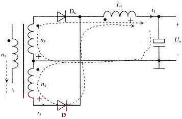 DC-DC改換后的整流管運用了三只:D5,D6和D7,沒有獨立設置續流二極管,不同于其他電源電路。D5為續流而設置的復用二極管,D6和是正鼓勵脈沖整流二極管,D7是反鼓勵電壓整流二極管。L4是DC-DC改換后的第一級濾波電感。在正鼓勵期間,變壓器輸出繞組n3經D6,L4輸出電流,第一級濾波電感L4中電流i4增大,同時,變壓器自身利益的鼓勵磁電流i1也在增大。